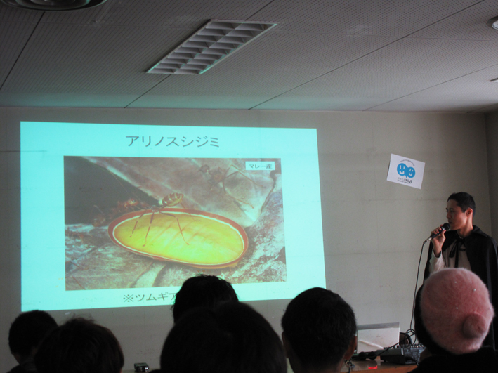 一日目は小松貴さんの好蟻性昆虫のお話。格好もトークも内容も、とにかく面白かったです。特に気になったのはツムギアリの巣から見つかったという湯たんぽ形の蝶の幼虫。かなり不思議でした。